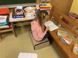 Je scinde les CP en deux groupes : un groupe avec moi sur les mathématiques (au coin regroupement) et un autre groupe en individuel sur le travail d’encodage, de lecture et de copie.