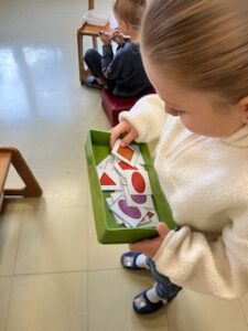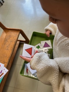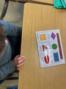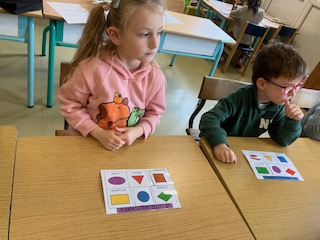 Sur la période, nous travaillons les différentes formes (caractéristiques et nomination pour les CP, reconnaissance et nomination pour les GS) : triangle, carré, rectangle, cercle (pour les CP) rond (pour les GS, qui les appellent des cercles, ce qui est très bien !), parallélogramme (qui n’est pas au programme mais c’est une figure manipulée avec le tangram).